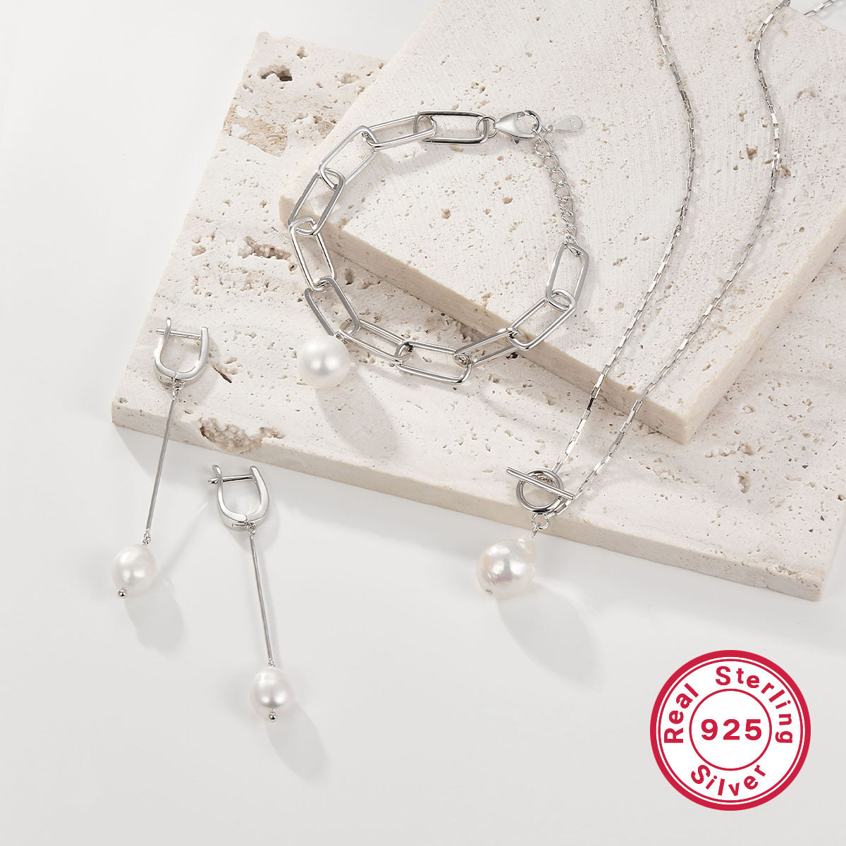 | Design & Style | Color Option | Earrings: White Gold; Pearl Bracelet: Silver |