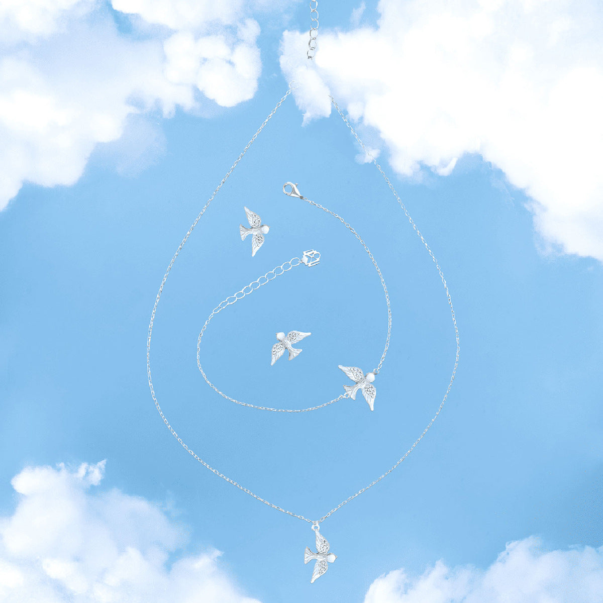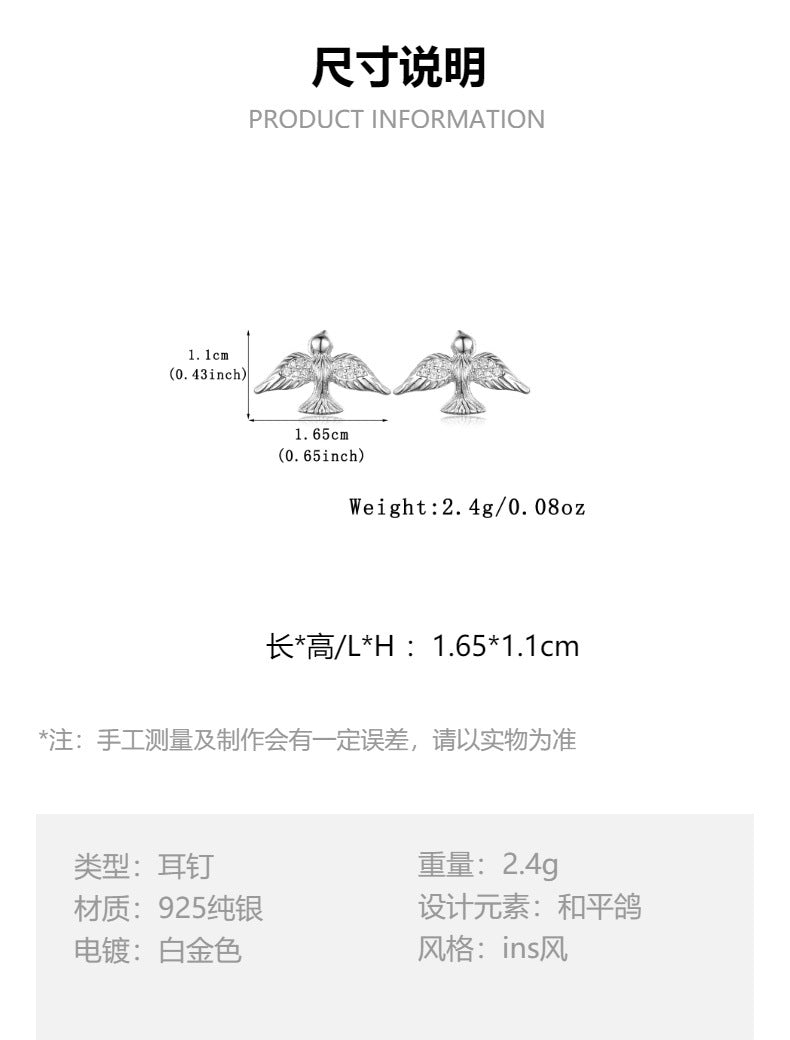 | 基本信息 | 产品类型 | 女士ins风独特时尚925银精工和平鸽首饰套装(项链+手链+耳环) |