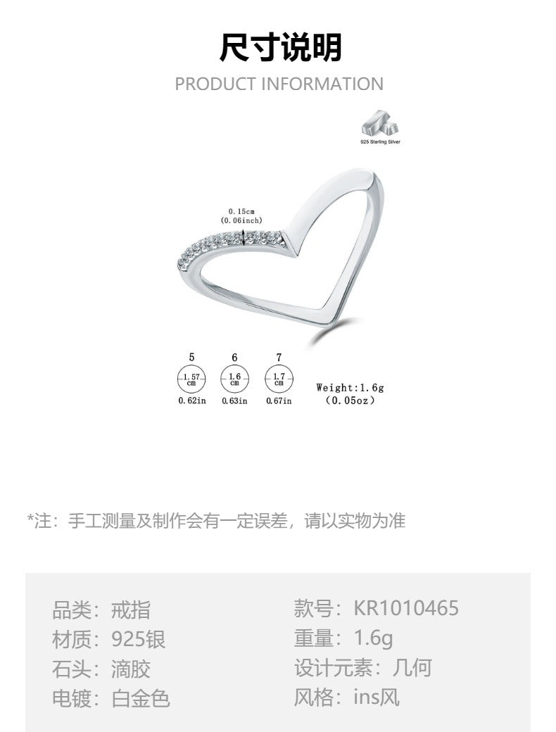 | 基本信息 | 产品类型 | 女士简约个性时尚925银镀铑心形V字戒指 |