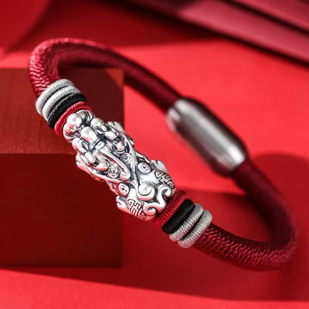 Channel the fierce protection of ancient myth with this hand-braided talisman, crowned by a Pi Yao—the legendary Chinese guardian of wealth—cast in bold 925 silver. Revered for devouring misfortune and attracting abundance, the mythical beast’s intricate form balances ferocity and grace, oxidized to accentuate its primal allure. Anchored to a supple, handwoven cord and secured by a sleek stainless steel magnetic clasp, this piece merges sacred symbolism with modern ease. The braided texture echoes resilience, while the magnetic closure whispers of intuitive wearability.