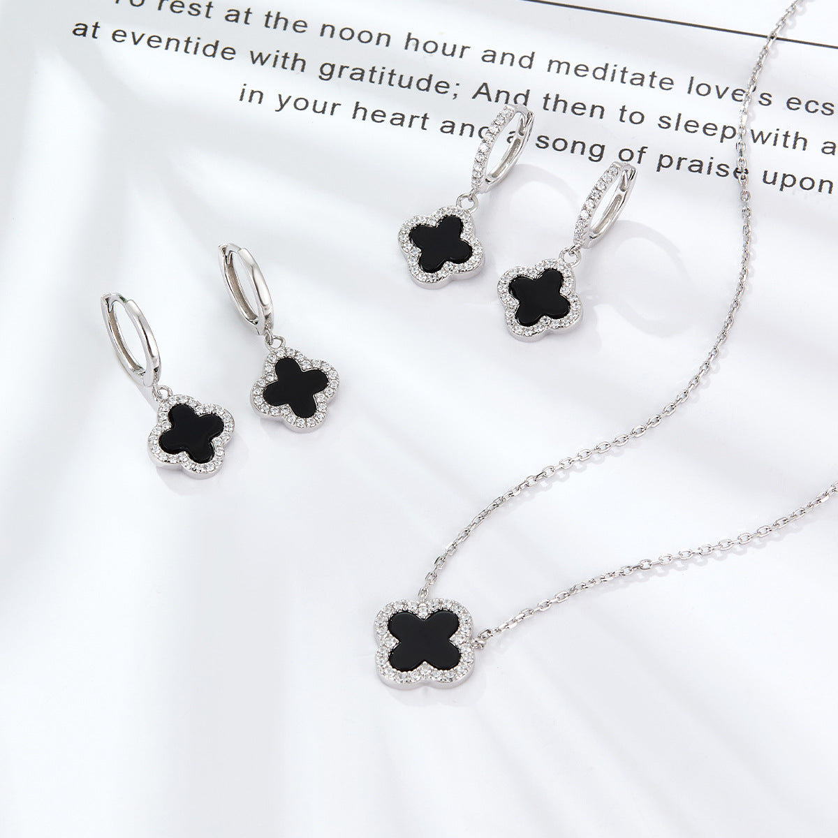 Four Leaf Clover Necklace & Earrings Set - Sterling Silver Black Agate Jewelry Gift