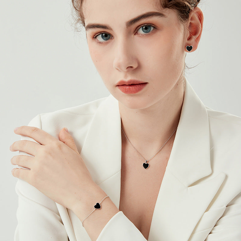 | 主要特点 | 主要卖点 | S925纯银首饰,低致敏性,抗氧化,欧美奢华风格,心形天然黑镀玛瑙,抛光3D细节,金色/白金,套装及单件可选,可调节链长41-50厘米,时尚通勤必备,日常及正式场合皆有。 |